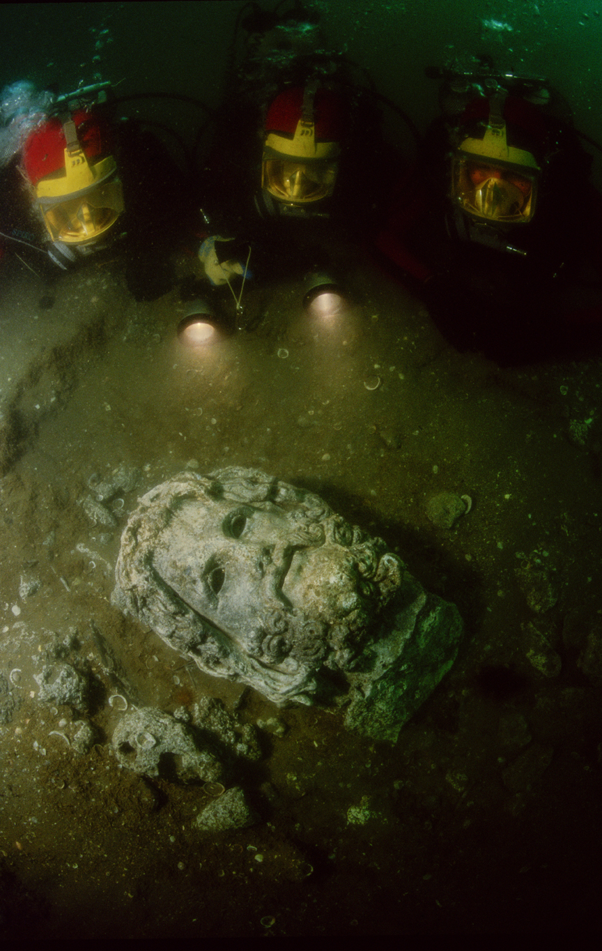 Divers discover the head of a statue; Thonis-Heracleion, Egypt, Courtesy of St Louis Museum of Art; Photo: Christoph Gerigk©FranckGoddio/Hilti Foundation
