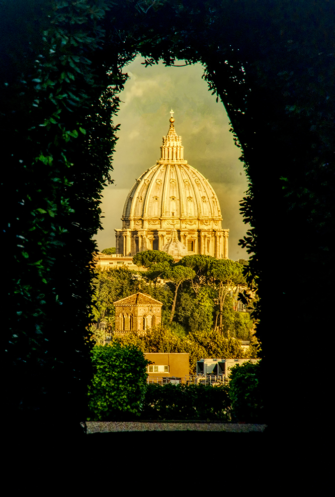 Keyhole at sunrise_DSC2895_7248 Published October 25, 2018 at 674 × 1000 in The Keyhole of the Priory of Malta, Rome ← Previous / Next → Looking through Rome’s keyhole Looking towards St. Peter’s Basilica through the keyhole in the door of the Priory of Malta on Piazza Sant’ Anselmo, Rome.